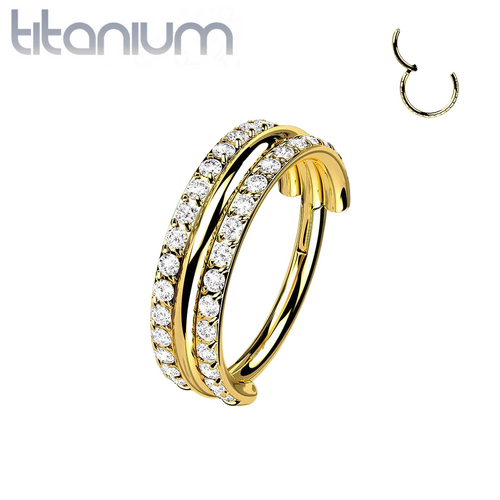 Implant Grade Titanium Gold PVD White CZ Double Line Plain Center Hinged Clicker Hoop