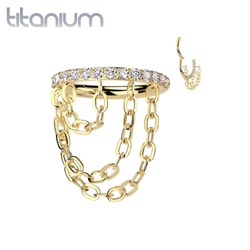 Implant Grade Titanium Gold PVD White Pave CZ Triple Chain Dangle Hinged Clicker Hoop