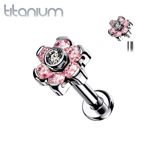 Implant Grade Titanium Internally Threaded Pink CZ Flower Flat Back