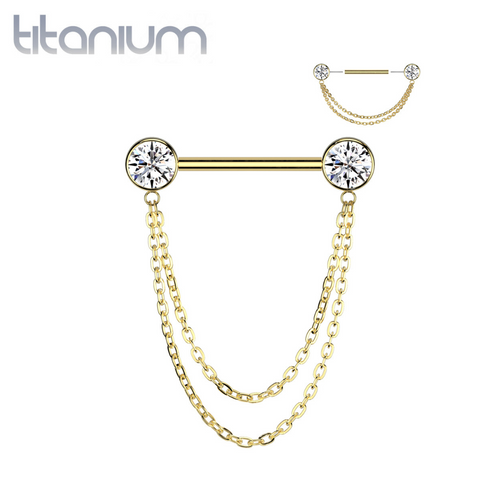 Implant Grade Titanium Gold PVD White CZ Bezel Chain Dangle Threadless Push In Straight Barbell Nipple Ring