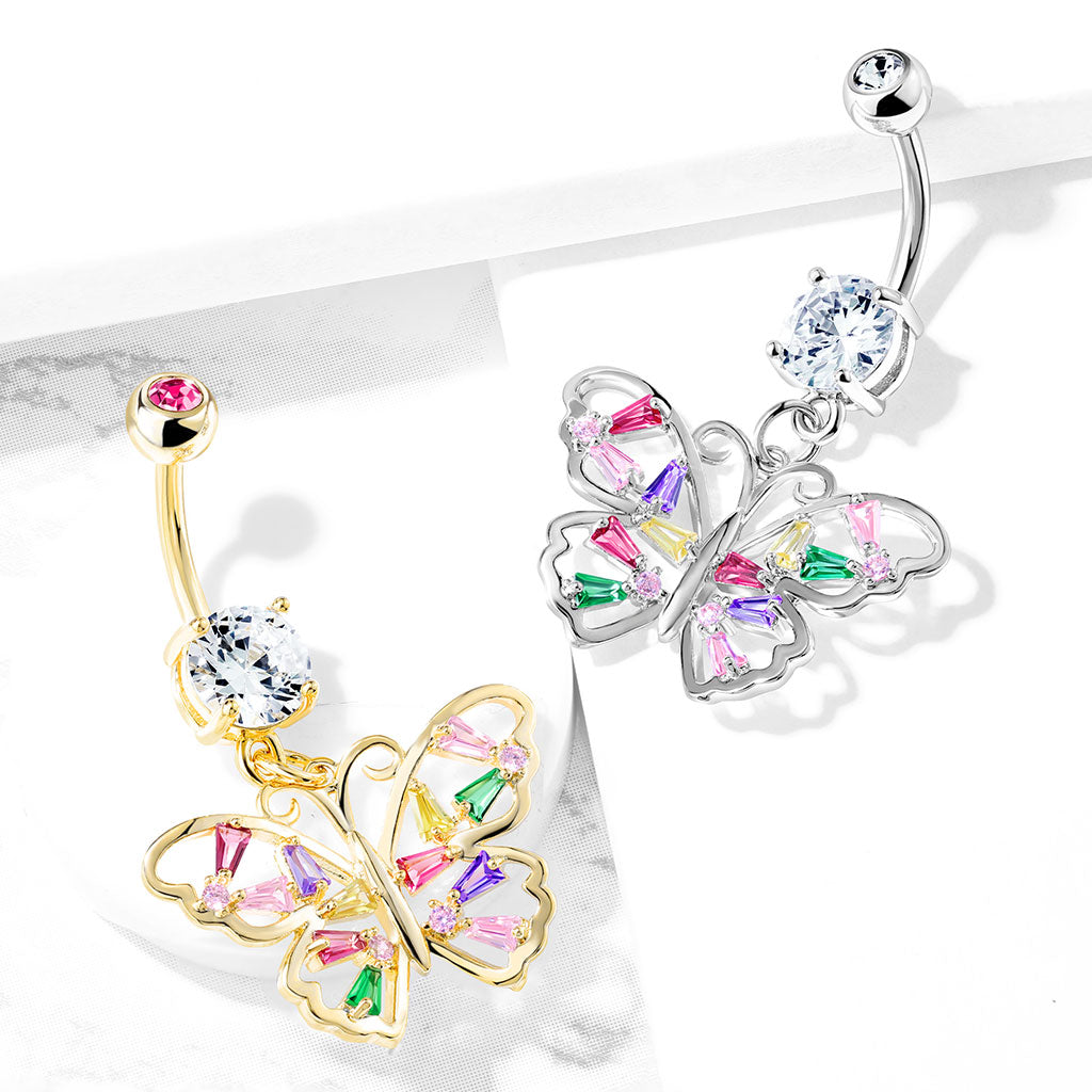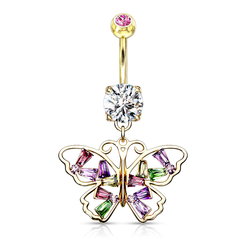 316L Surgical Steel Gold PVD Large Multi Colour Gem Butterfly Dangle Belly Ring