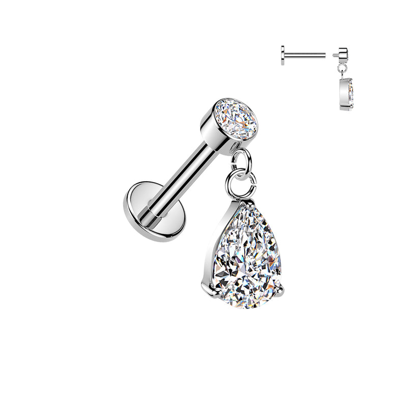 316L Surgical Steel White CZ Teardrop Dangle Internally Threaded Flat Back Labret