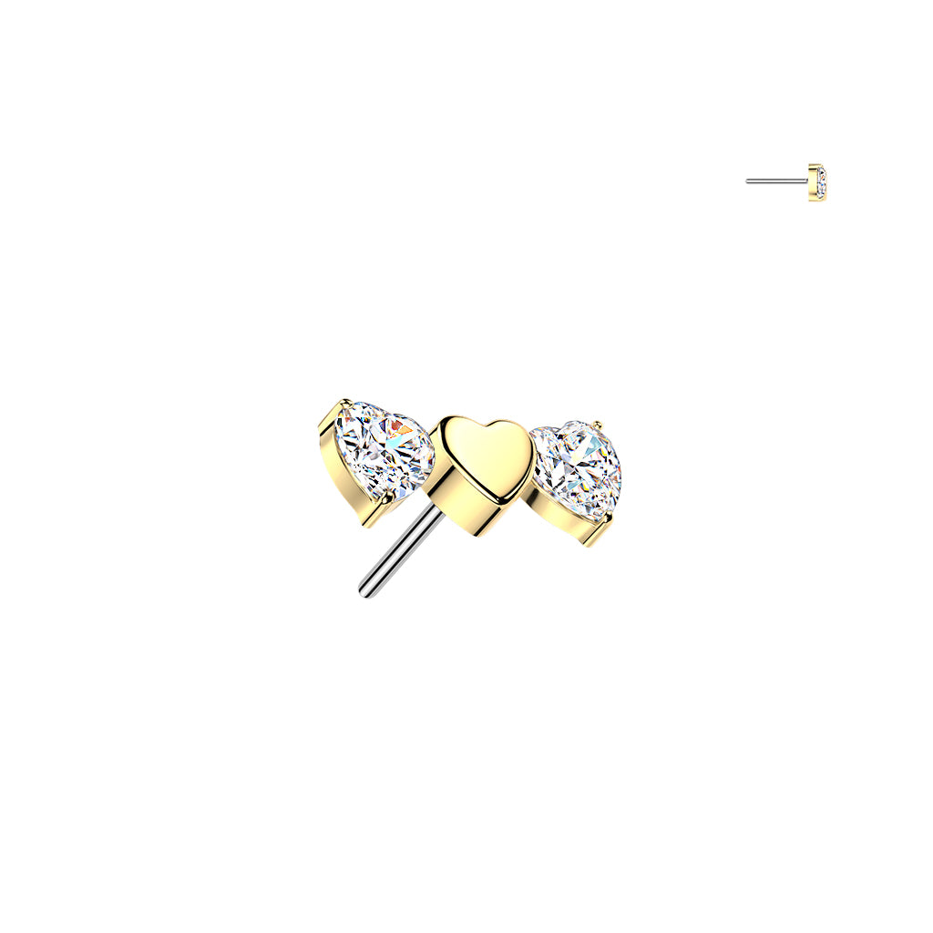Implant Grade Titanium Gold PVD Triple Heart White CZ Bar Top Threadless Labret With Flat Back