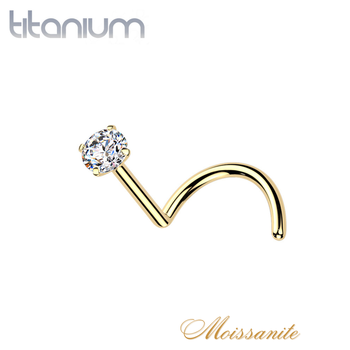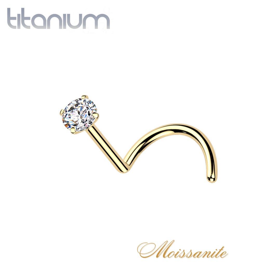 Implant Grade Titanium Gold PVD White CZ Moissanite Corkscrew Nose Ring