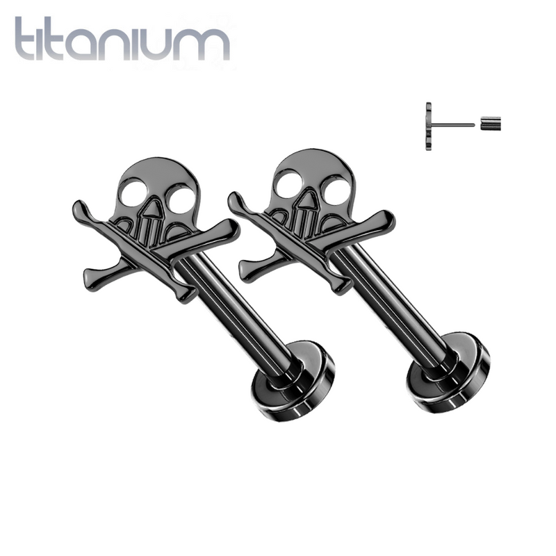 Pair of Implant Grade Titanium Black PVD Skull and Crossbones Push In Threadless Earrings With Flat Back