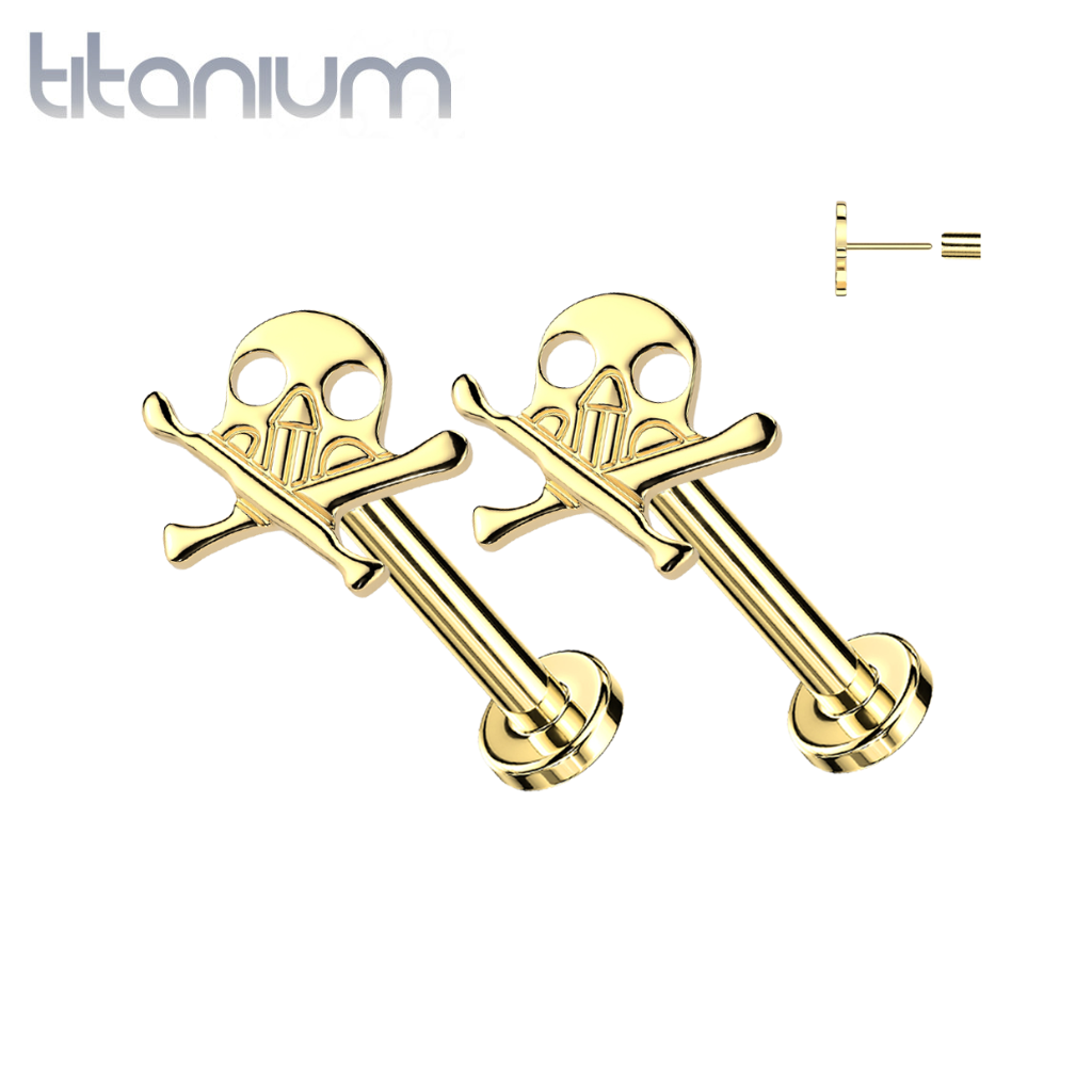 Pair of Implant Grade Titanium Gold PVD Skull and Crossbones Push In Threadless Earrings With Flat Back
