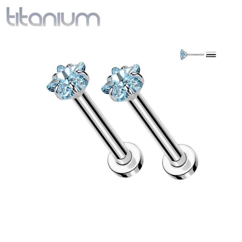 Implant Grade Titanium Threadless Aqua CZ Star Shaped Gem Push In Labret With Flat Back - Pierced Universe