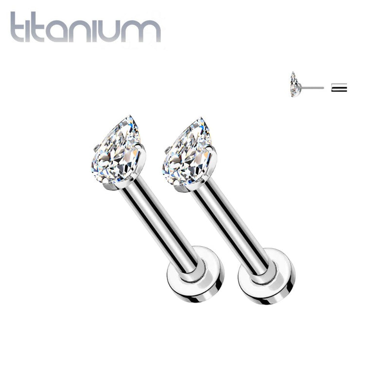Pair of Implant Grade Titanium White CZ Teardrop Gem Push In Earrings With Flat Back
